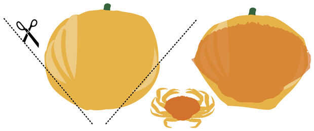 La calabaza que utiliza para el cuerpo del cangrejo era un poco demasiado esférica para un perfil crabbish plausible, así que había hackeado altura desde el fondo. Terminé con ese fragmento más adelante... para la merienda.