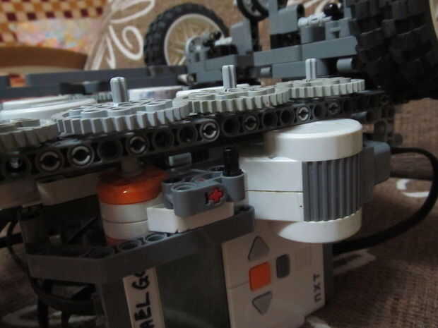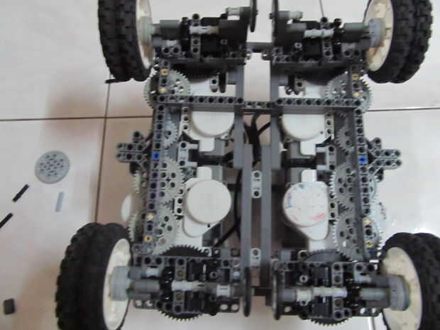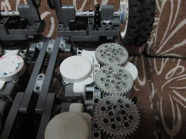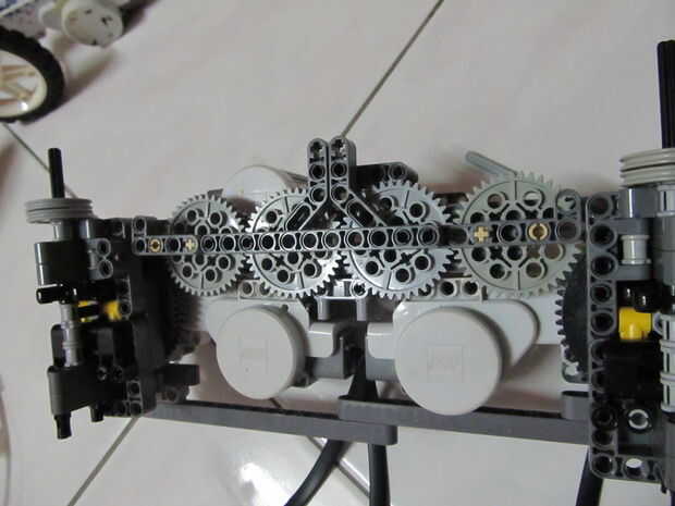 En tratar de mantener a mi plan de tener 1 NXT controlar una parte del robot, coloqué el motor giratorio en el centro de los robot y uso engranajes para transmitir ése esfuerzo de torsión a ambos extremos la clave aquí es que los engranajes de vuelta al plato