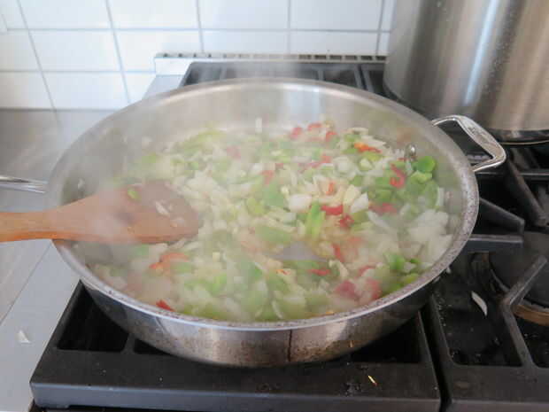Dorar la salchicha-tenía alrededor de 1 libra. Retirar de la sartén y luego agregar 1 cebolla, 2 pimientos verdes y 4 tallos de apio. Sautee estos.