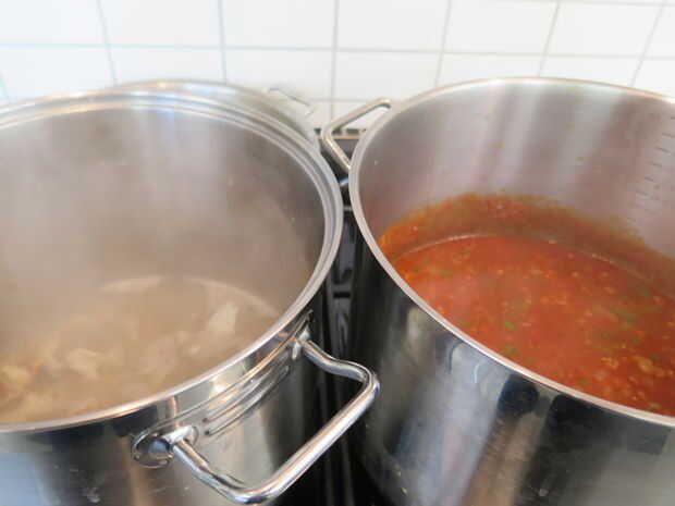 Añadir a sus existencias de carne de cerdo, 1 lata de salsa de tomate o tomates en conserva en cubitos y 1 pasta de tomate pueden. Combinar el caldo de carne de cerdo y caldo de cangrejo (después de que cuele hacia fuera las cáscaras del cangrejo) en una cacerola grande, luego añadir el chorizo verduras y especias. (2 hojas de laurel, 2 cucharadas paprika, escamas del chile rojo 2 cucharadas, 1 cucharada de sal, 2 cucharadas de pimienta)
