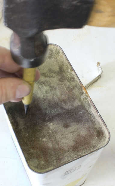 ¿Recuerdas aquellos insertos en el talón? En la parte superior e inferior de la lata medida dos correspondientes agujeros y perfore o perfore estos agujeros hasta puede caber una varilla roscada de 1/4" a través de ellos.
