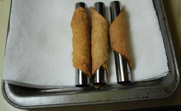 • Lugar una pila de toallas de papel en una bandeja para hornear para encender cáscaras de cannoli hecho - esto evitará que cualquier cosa rodando alrededor de