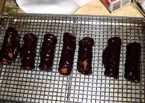Las conchas cannoli en el chocolate y reservar. Encantador, ¿EH? La cobertura de chocolate es realmente un poco fuerte, así que quizá quieras experimentar con diferentes chocolates (de leche, tal vez). O podrias poner una capa más ligera. Además, si haces el chocolate fino suficiente, podrá cubrir el interior que hará que los cannoli duran más.