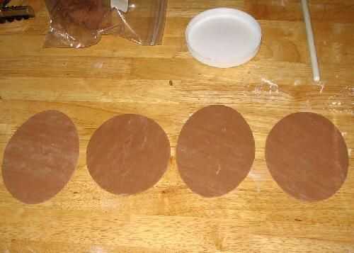 Ahora quieres cortar hacia fuera en 4" a 5" círculos. No tengo un cortador de galletas, pero la tapa de mi contenedor de azúcar (en la parte superior de la imagen) es el tamaño perfecto, por lo utilizo. Después de que están cortadas, desea hacerlas ligeramente ovalada en forma de. Puede atropellar con el palote o ejecutar a través de la fábrica de pasta en la misma posición. Aquí son míos: los dos que no son demasiado ovales realmente funcionó a través otra vez para hacer más oval, pero se olvidó de tomar fotografías. También, si desea puede reflatten la masa sobrante y probablemente obtener 6 o más cáscaras de una cuarta parte de la masa que hemos hecho. sí, eso es un montón de conchas.