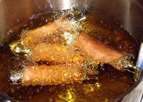 Establecer su freidora en algún lugar entre 360 a 375 (grados Fahrenheit). O, si eres como yo, caliente el aceite a esa temperatura. Vas a quiere cocerlos hasta que estén marrones y burbujeante, que le llevará de 2 a 3 minutos. Esta fue mi primera vez profunda freír nada, así que una cosa que aprendí acerca de freír sobre una estufa es que una vez que pones las cosas en, la temperatura caerá mucho. De todos modos, te parecen esto en la olla cuando haya terminado: