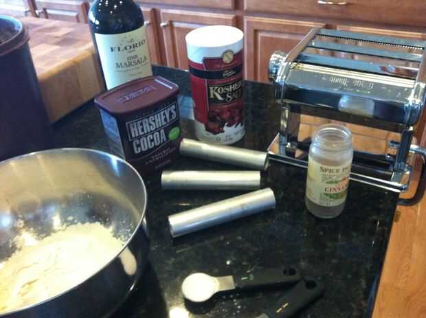 Combinar harina, azúcar, cacao en polvo, canela y sal en un tazón mediano. Añadir el Marsala y el aceite y batir a velocidad media hasta conseguir una masa lisa. Amasar a mano sobre una superficie enharinada ligeramente hasta liso y elástico. Envolver en plástico y déjela reposar durante 30 minutos.