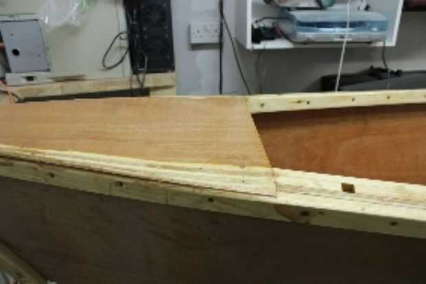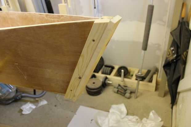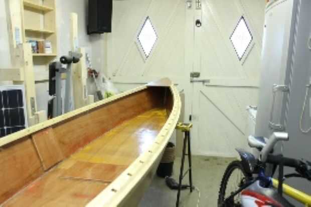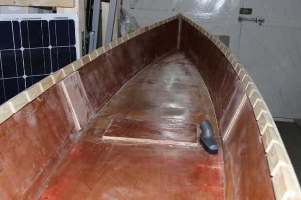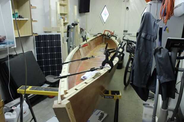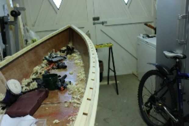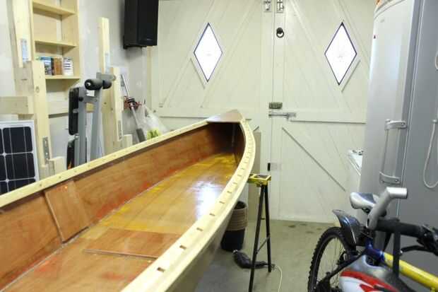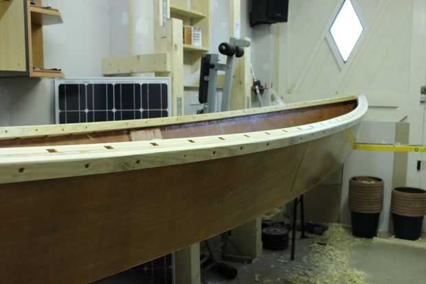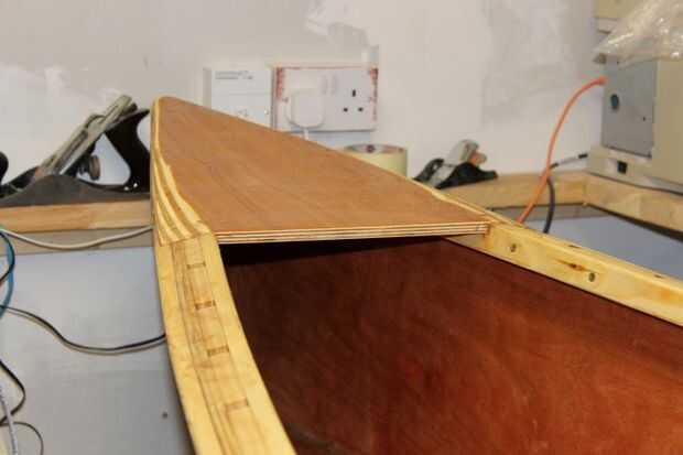 Cada extremo de la canoa corte un pedazo o capas de forma pegada y atornillada en su lugar y luego cepillar en forma.