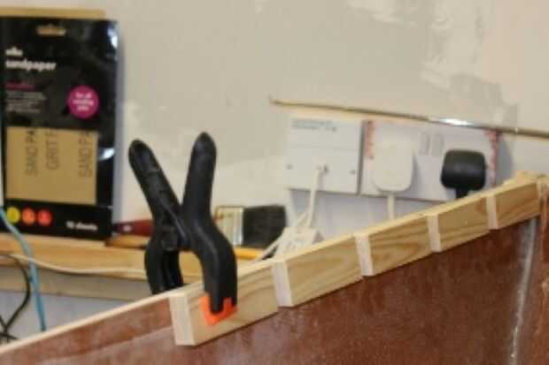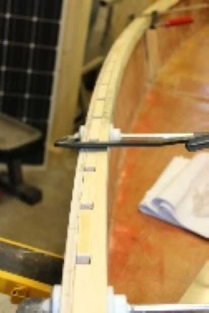 Ahora podemos añadir los rieles de la frotación. Hice una serie de bloques de madera aproximadamente 3 pulgadas de largo. Estos donde pegado al interior de la canoa con una separación de 1/2 pulgada en el medio. Usé pegamento de madera para esto y luego atornillado a través de la parte exterior de la capa en cada bloque para mantener en su lugar. El riel de roce externo era pegamento en su lugar y atornillar a través del riel, capas y en los bloques. El carril interno puede pegado en su lugar y atornillar.