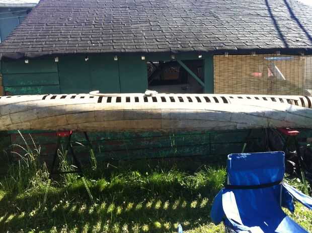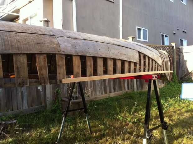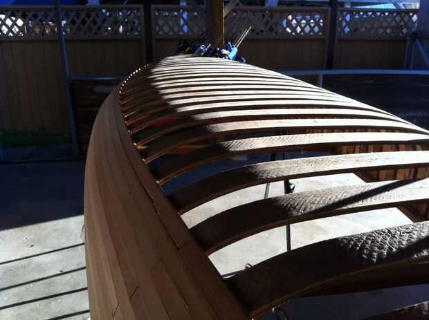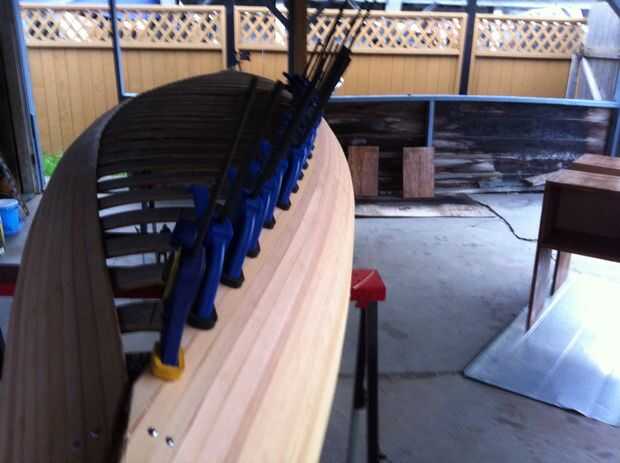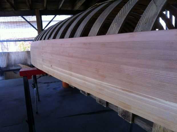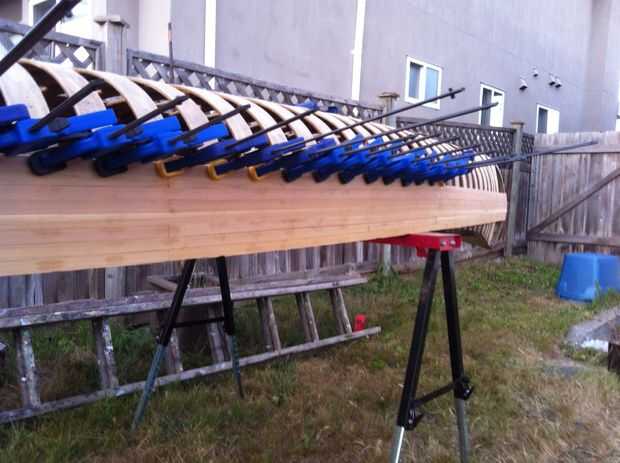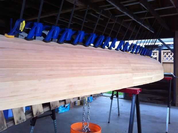 He despegado bastante de las tablas de cedro para las primeras hileras y lija suave en las costillas. He utilizado llano abrazaderas de pegamento y barra de madera blancas. Todo el proceso tomó cerca de tres meses. La mayoría de los pasaron esperando el pegamento se seque. En un muy pocos donde las tiras tuvieron torsión importante necesitaba tornillos para sostenerlos en lugar. Que dejó algunos pequeños agujeros que luego rellena con masilla de madera.