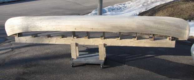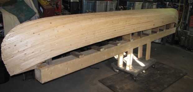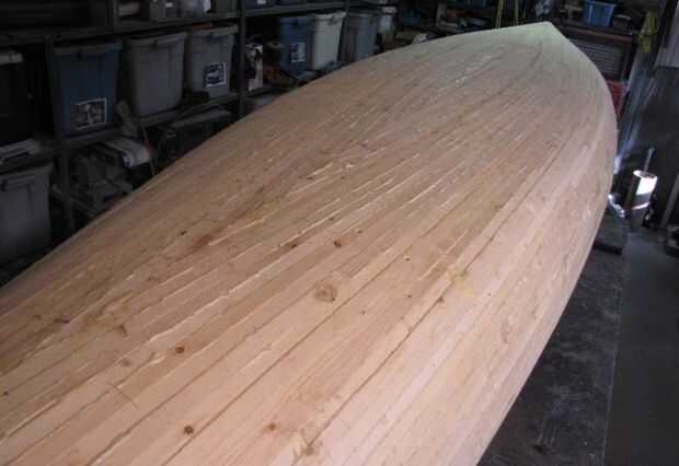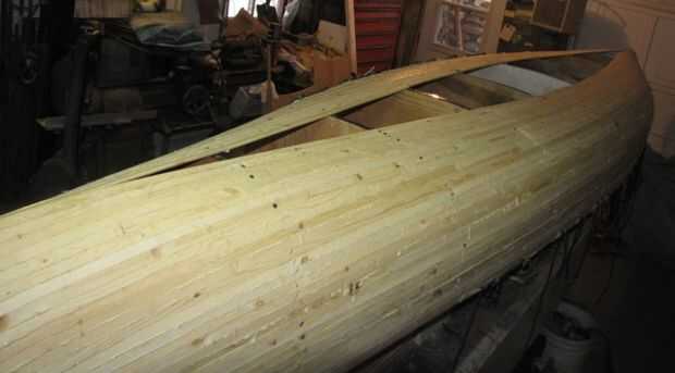 Fondo de la embarcación antes del paso de lijado. Grandes grietas tienen veranos llenos de poliuretano pegamento y aserrín fino.