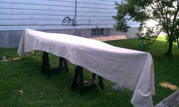 Cuando todo fue con grapas a lo largo de la quilla, los tallos y a lo largo de la borda, yo estaba dispuesto a darle la vuelta y recortar a la tela sobrante. En este punto está buscando realmente como una canoa y mis vecinos dejó de darme la stinkeye ole.