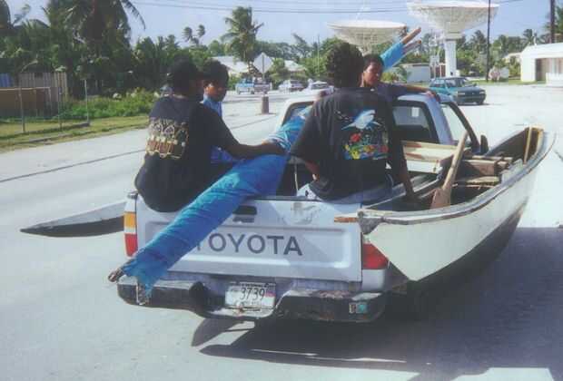 Aquí es cómo llevan canoas en camiones en Majuro. Bastante gente se venga para que el paseo a alzarlo y llevarlo a la playa. Se necesitan 4 o 5 personas para hacerlo bien. Eso es bueno, porque cuando vienes cansado volver con una carga de pescado, te ayudaré una vez más, y tendrás alguien dé su abundante pescado para.