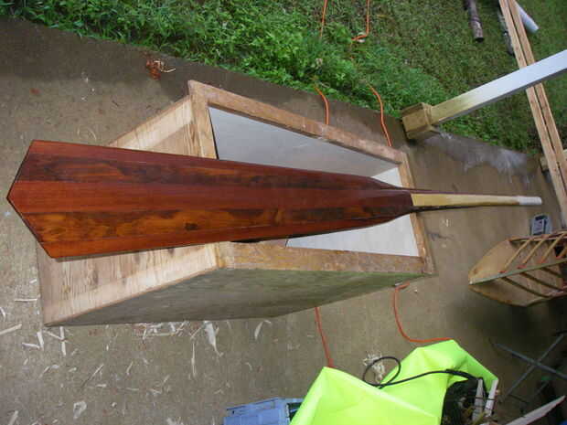 Había agotado todos mis pinceles con epoxy, así que corte un swatch de trapo y utiliza para limpiar el remo todo con aceite de linaza. Se ve buena. Y si el barco estuviera listo podría considerar vela ahora.