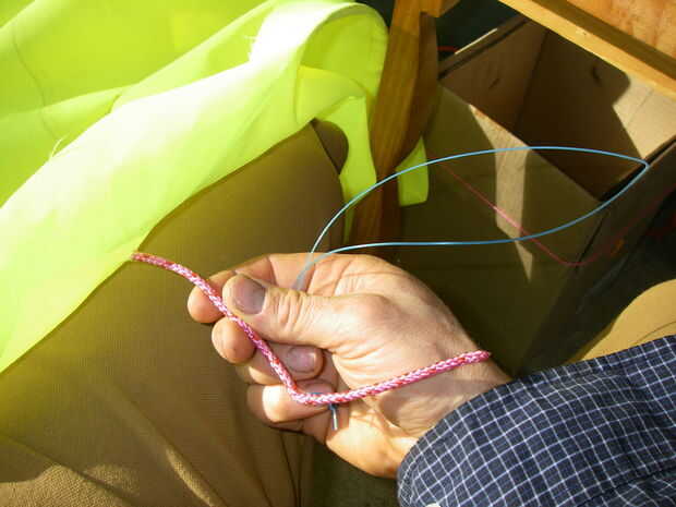 Haga un bucle de hilo o monofilamento pesado. Línea de malezas-wacker funcionaría. Pellizcar el extremo así que puede meter el lazo a través del agujero en la tela. Atar el lazo a un mango de algún tipo por lo que se puede tirar sin lastimar la mano.