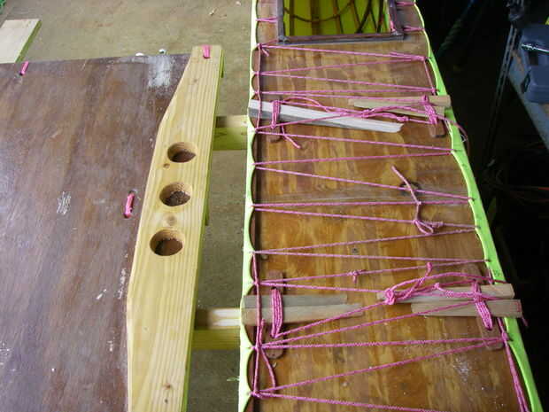 Un bucle de cuerda vaya a través de agujeros en la cubierta, alrededor de las vigas de kie y a través de agujeros en un tablero transversal que cuelga por debajo del kie.