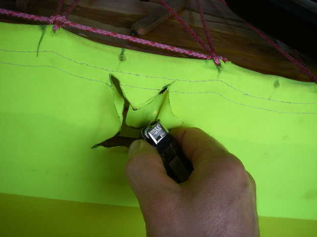 Corte a lo largo de las líneas con un cuchillo afilado. Corte desde el centro hacia afuera para no hacer el agujero todo más grande que debe ser. Derretir los bordes con un encendedor para reducir desgaste.