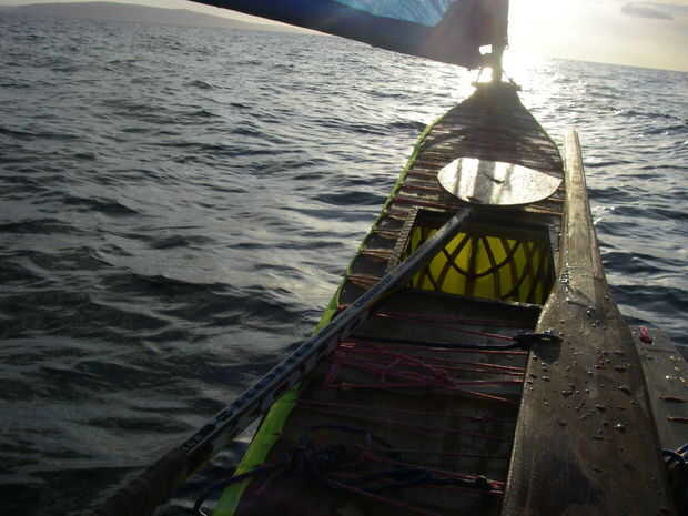 He probado con el remo y la paleta de dirección. Hice la paleta de un palo de hockey con una hoja de madera contrachapada atacó a él. Resultó muy bien. Miré a mi alrededor para él. Se había ido. Cayó en el agua cuando estaba usando el remo y no notarlo. Navegó detrás buscando, pero ya era demasiado tarde. Voy a poner una dirección de retorno en otro.