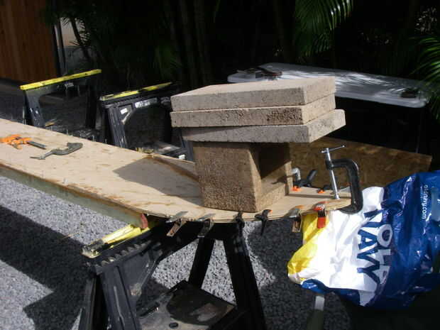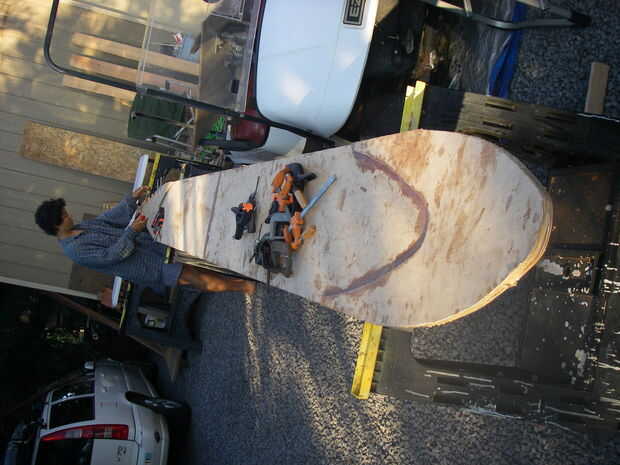 Mezclar pegamento epoxi como en el paso 6. Pintura sobre cada superficie de contacto. Pila encima de las láminas. Uñas las colas de los cheekpieces a través de la cubierta en la borda. Doble la pila hacia arriba en un ángulo agradable. Creo que mis 4" o 5" por encima de la cubierta. Ponga una pinza en la nariz. Había apoyado la nariz en una silla plegable. Se trata de ajustar el radio de la curva, poner todas las láminas bajo presión buena. Prueba con algunas láminas de cartón para ver cómo funciona. Para mayor seguridad, coloque las abrazaderas más a lo largo de los bordes. Libra algunos clavos temporales si crees que es necesario. Pila de ladrillos y las baterías de coche en él para alegría de sujeción aún más.