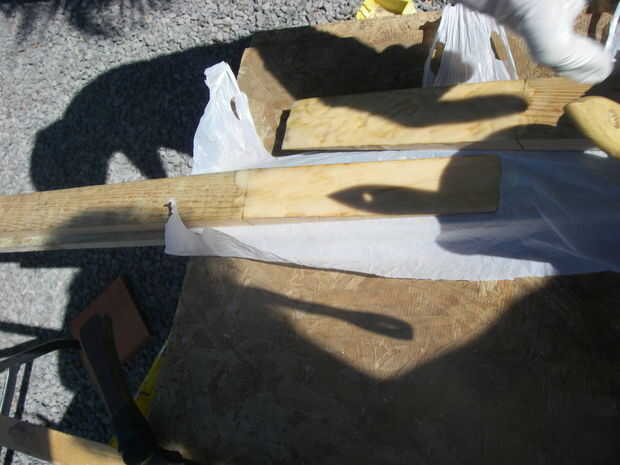 Cortar una bolsa de plástico plano y colocar en una placa de scrap. Será el tablero del forro para mantener recta la bufanda. La bolsa de plástico mantiene su bufanda de conseguir pegado en el tablero del forro.