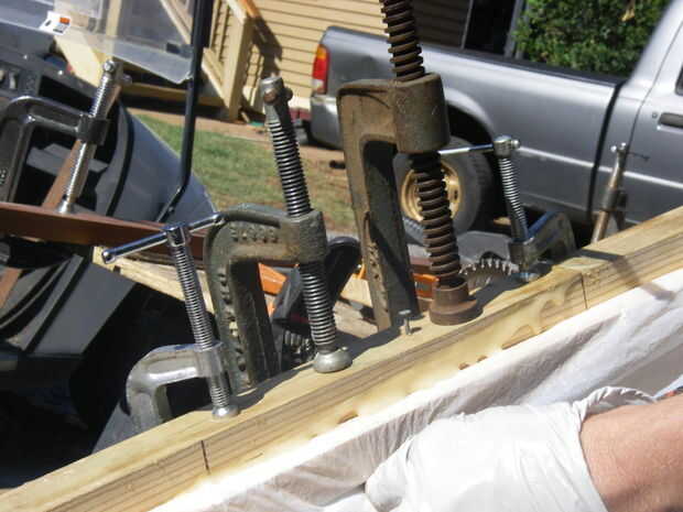 Libra una clavo en para evitar deslizamiento. Sujete el infierno fuera de ellos. Realmente con el epóxido se supone para evitar que una articulación"hambrienta" de overclamping. En realidad nada es lo suficientemente plana para ello. Con otros tipos de pegamento que desea un ajuste perfecto de la madera de madera.