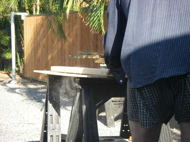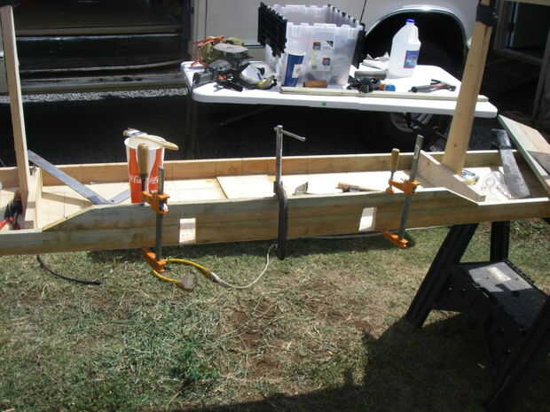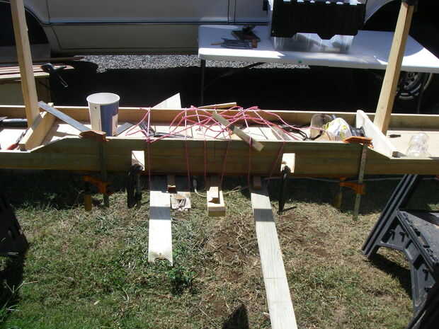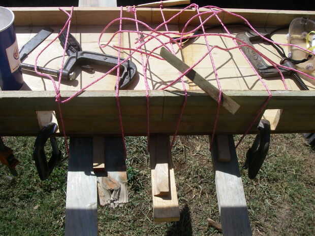 Para hacer las tomas aserrado muescas cuadradas completamente a través de la borda. Luego hizo una junta muesca coincidente para encajar sobre él, pegado y había atornillado en su lugar. No tengo suficientes abrazaderas abiertas para hacer el trabajo, así que utiliza cuerdas, palos y cuñas en su lugar.