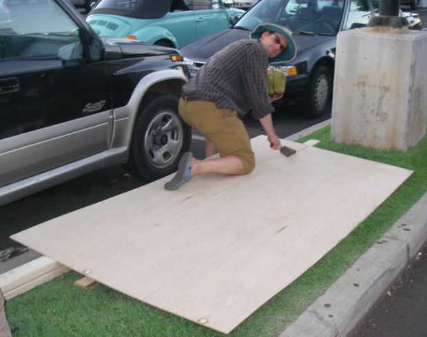 No tenemos cualquier madera contrachapada delgada bastante para la cubierta, por lo que se rompió y compró una hoja de 1/4" madera contrachapada de Luan. También conseguimos algunas placas resistente a la putrefacción "boratados" a la sierra para arriba para los largueros, plumas y otras partes. La cubierta sería 16" de ancho, por lo que asierra la madera de 48" de ancho en tercios a lo largo (48"/ 3 = 16") con un pullsaw japon para facilidad de transporte y hacer algún progreso inmediato. Bebimos unos cocos haciendo eso y atar la madera en el carro con los tirones del camionero.