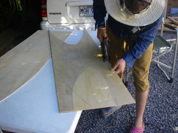 El tercio de la hoja de madera contrachapada restante se corta en arcos góticos más laminar en las puntas para que sean fuertes. Que parte de un barco se llama "breasthook".