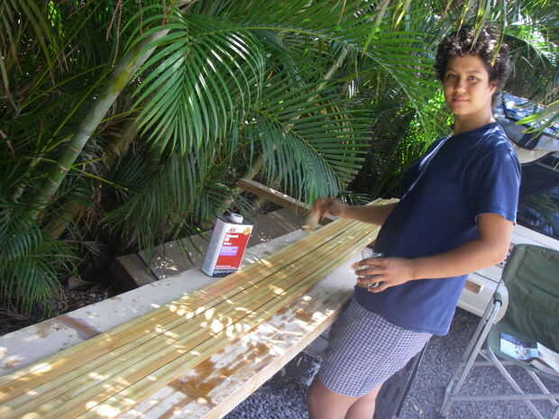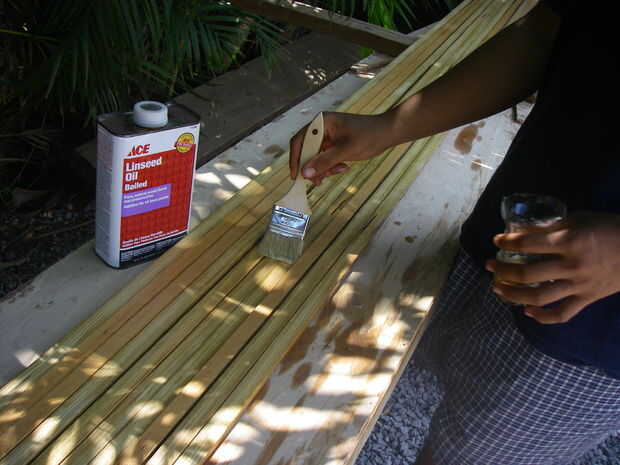 Pintar todos los listones con aceite de linaza. Y todo lo demás que no revestida con el epóxido. Algunos tipos de madera sobreviven mejores con linaza, algunos con epoxi. Absolutamente no he averiguado Cuáles son las reglas. Hacerlo en la sombra. La luz del sol lo gelificará antes de que tiene la oportunidad de disfrutar adecuadamente, y habrá goop desagradable en sus palos.