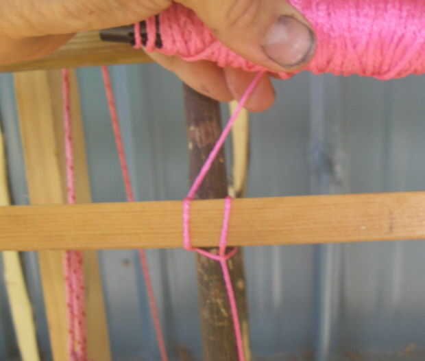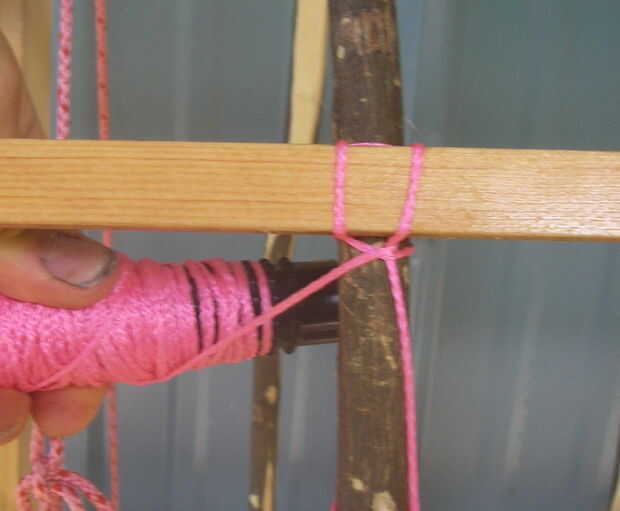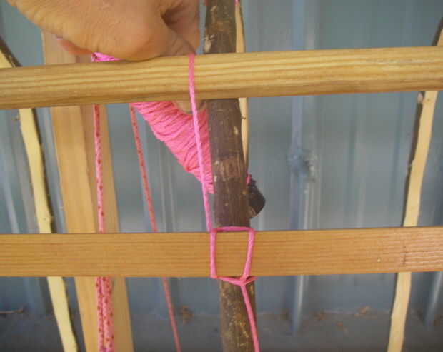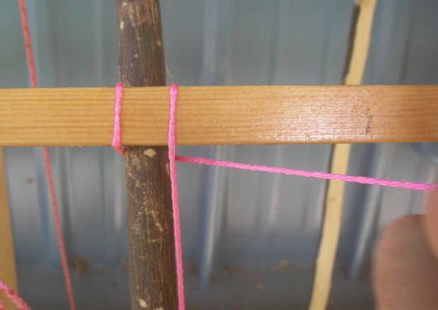 Pasar sobre el larguero, detrás de la costilla y sobre la viga otra vez. Tire firmemente.