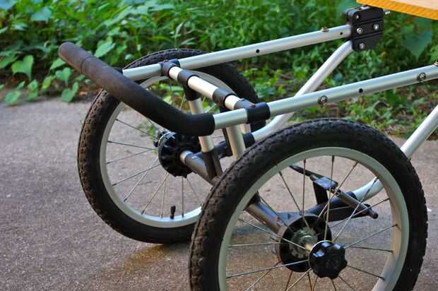 esto es un portador de canoa o kayak modificado de una carriola de trotar.  La silla de paseo fue comprado en un garaje saie y sólo requiere una broca pequeña de la reingeniería para crear la compañía. Esta marca fue hecha por soñador diseño y se llama primera de Fitness. Las ruedas son desmontables (ideal para guardar en una canoa) y el marco se hace del tubo de aluminio.  También es de destacar el freno de la rueda trasera que se utiliza para evitar que el portador corriendo mientras que usted está tratando de silla con una canoa.