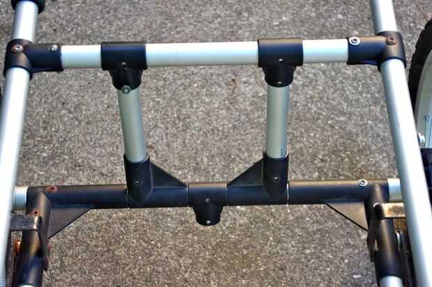 Las partes inferiores de los soportes verticales ahora pueden ser deslizadas en las juntas T Unidas al eje. Esto completa el marco principal formado por las costillas frontales, la cama carrito y los soportes verticales. Tenga en cuenta que la cama horizontal está por encima de las ruedas lo que permite un amplio barco posible.