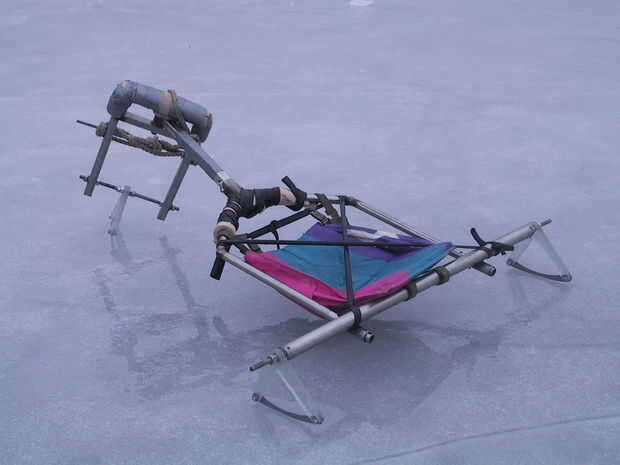 Inicialmente, I corte unos patines para hielo de acero, afilada en una lijadora de banda y empernada en buggy arena vieja de Saúl. Este cochecito de hielo se movió rápido, pero sentí que estaba siempre se salgan de la sede de la cometa.