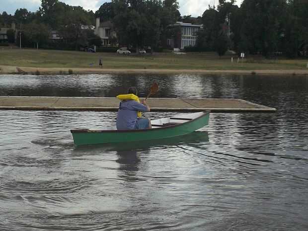 La manera oficial de remar en una canoa como esta con una persona en la debe sentarse en el asiento delantero mirando hacia atrás. Siendo perverso trató de remar desde el asiento de atrás hacia adelante y encontró que la comodidad del respaldo parece compensar la nariz extra ligera de wateredness.