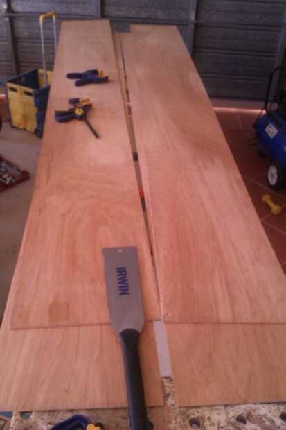 Únete a los lados en el medio utilizando su madera favorecida a método. Usé un Bolger / fibra de vidrio de fibra de vidrio común donde mojado Payson es mentida en el piso encima de una hoja de papel encima de una hoja de plástico sobre un pedazo de alfombra de hornear. Nunca he tenido lo suceden a mí pero estoy suponiendo que no es divertido tener madera contrachapada ajustaron a su piso del garage. Las dos piezas a unir se colocan cuidadosamente en la parte superior y más fibra de vidrio se agrega a la parte superior. Papel de la hornada más, plástico, un poco de un tablero plano y una pesada caja de herramientas o peso similar para mantenerlo plano. Los expertos recomiendan una tira de 3 pulgadas de fibra de vidrio.