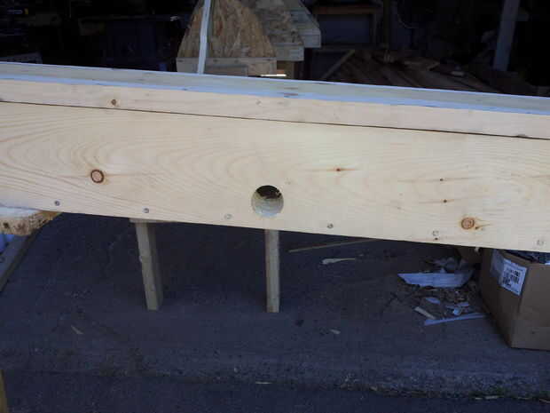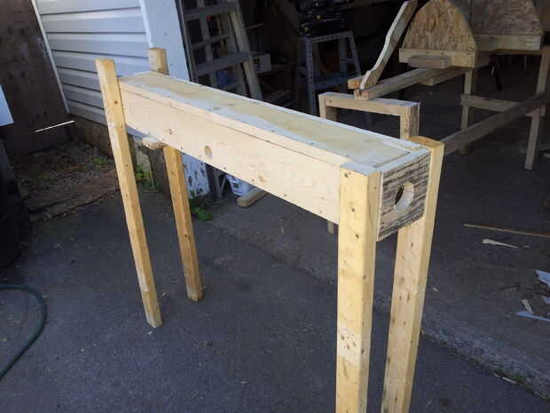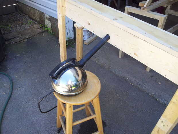 La caja de vapor es un diseño muy simple. Se hace de 1 x 6" tableros de pino, atornillados junto con patas de 1 x 3". Ahora, teniendo en cuenta que son básicamente llenarlo con agua, que agua va a necesitar un lugar para ir, por lo que las patas traseras son realmente unas pulgadas más largas que las delanteras, y un agujero se perfora en la parte inferior para permitir el drenaje, por lo que su madera no termina de sentarse en una piscina.