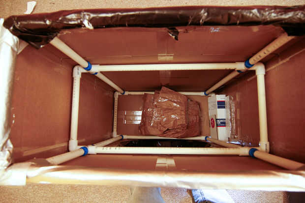 quería el traje para ser algo resistente, por lo que la estructura principal es de PVC. Yo no tenía ningún cemento PVC así que graba solo los puntos de conexión de la estructura. Asegúrese de que toda la estructura es lo suficientemente grande para adaptarse a ti y y tienes una caja de cartón lo suficientemente grande para que lo rodean. Tuve uno que era grande suficiente así que terminé grabando y doblar cajas de cartón pequeñas para hacer que la piel de la cámara.