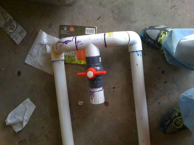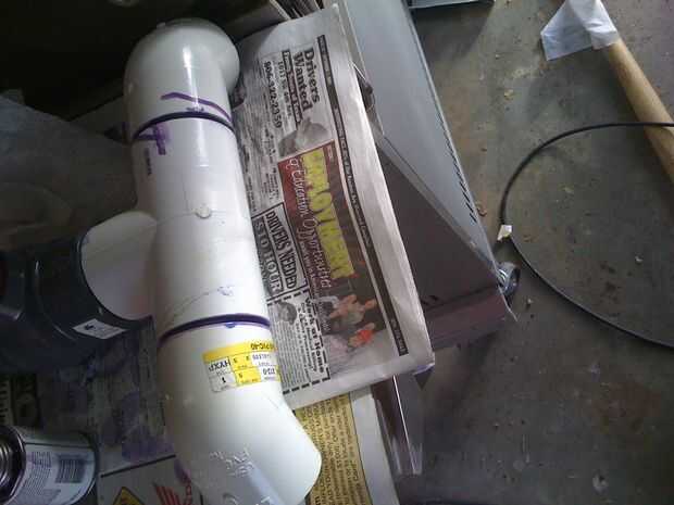 corte 4 secciones de la pipa del pvc de 1 3/4 de pulgada largo 2 pulgadas diámetro y limpie los limpie y cemento 2 de ésos a las cámaras de presión y luego a los 45 grados codos luego cemento esas Asambleas a la t con las otras secciones de tubería de 2