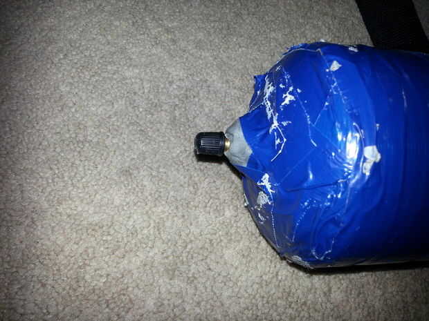 6) tomar la masilla epoxi y lea las instrucciones. Asegúrese de que seguir todas las direcciones. Poner en un par de guantes. Tomar media la masilla y se mezcla en tus manos. Después de mezclar bien tiene alrededor de 1 minuto para colocarlo. Colocar en la base de la válvula de aire y envuelva alrededor sin aire puede escapar. Aplique presión sobre la masilla y comprimirla. Luego tomar aproximadamente 1/4 de la masilla y aplicarlo a la parte de la válvula que sobresalen hacia fuera del interior de la tapa. Asegúrese de que la masilla no bloquee los orificios de la válvula de aire. La masilla epoxi comienza a calentarse después de 2 minutos. Esto significa que está curado. Que establece al menos 3 horas.