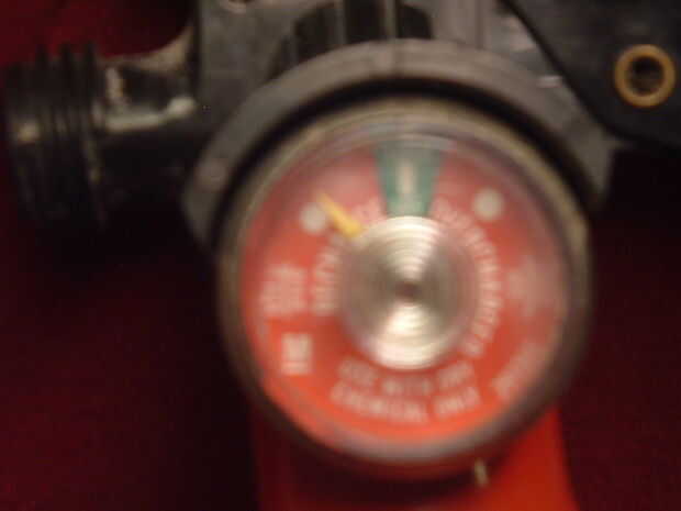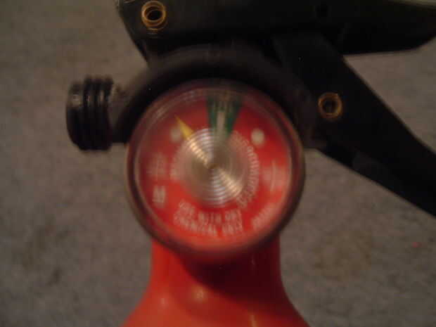 En mi extintor, theres un calibrador de presión de pequeño que te dice cuantas PSI está contenido en el extintor en ese momento. La zona verde en este calibre pequeño es el PSI recomendado para un uso normal,,, y también debe tener una marca de advertencia después de la zona verde. Yo no recomendaría tratando de la PSI cerca de la marca de advertencia, a menos que usted lo quiere hacer estallar en su cara,,, y te mueres!
