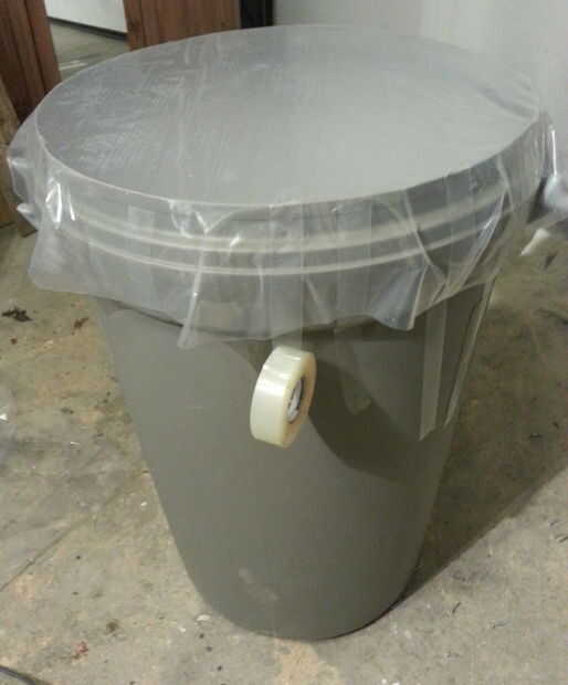En primer lugar, cuelgue el plástico de la abertura de la basura y recorte el exceso completamente para dejar unas pocas pulgadas. Luego tomar las tiras de cinta adhesiva y fijar el borde; Usé cinta de calcetín de hockey que tiene un poco de elasticidad en ella. Después había tirado el plástico relativamente enseñó, le puse una tira alrededor del borde superior. También puede utilizar una cuerda bungee alrededor de la circunferencia (no cortar el plástico tan corto en este caso).