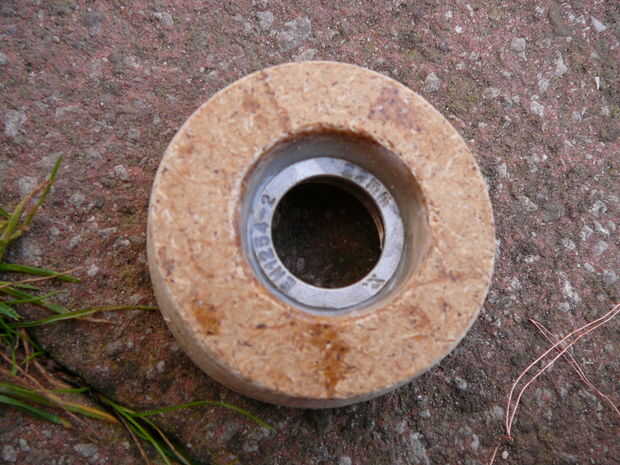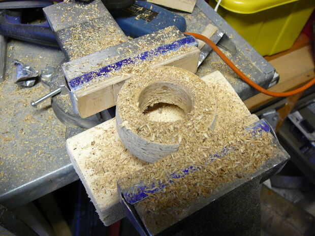 Después de esta conformación externa, perforé el centro a 30mm (con una broca forstner) porque era la más cercana a lo 27mm de diámetro de la tuerca.