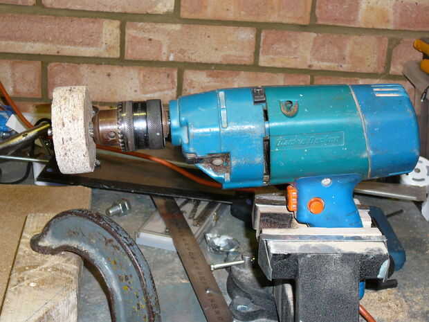 Step5: Encienda el taladro y empezar a lijar (mi taladro tiene un botón modo que no tengo que continuamente tienen que sostener el gatillo, pero si el tuyo no lo podría utilizar cinta o similar) asegurándose de que use gafas de seguridad, la configuración no es ideal y potencialmente peligroso. Otra precaución de seguridad y el confort sería usar una máscara contra el polvo o pedazo de tela sobre la boca y nariz ya que puede hacer mucho polvo.