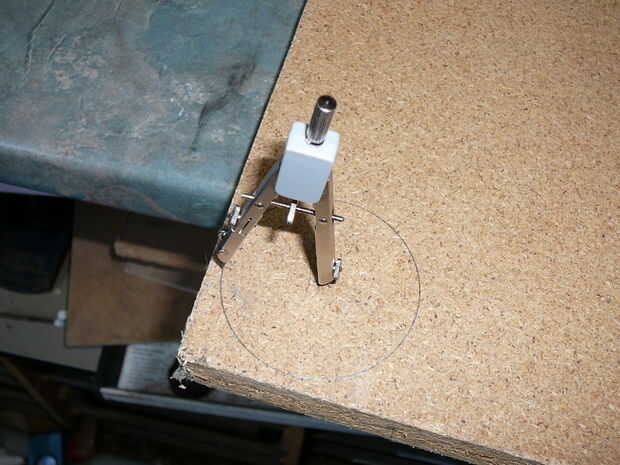 Paso 2: Haga un orificio de 6mm en el centro del círculo (había una marca dejada por las brújulas) y poner un rod(or bolt) rosca corta (M6) a través del agujero con una tuerca en el extremo.