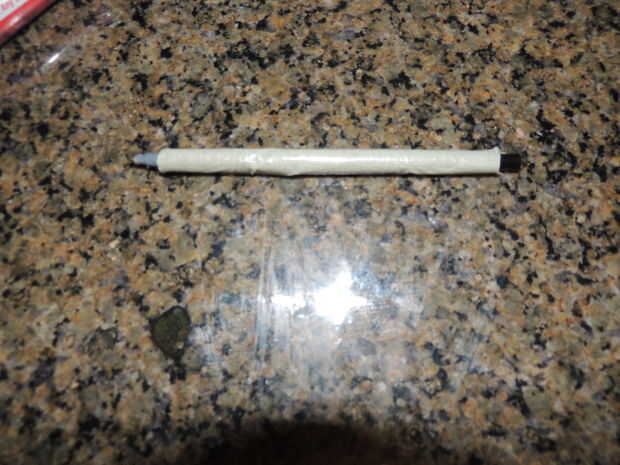 Tomar la pluma y envolver un trozo de cinta adhesiva alrededor de él tan firmemente como sea posible con el lado stcky hacia fuera.
