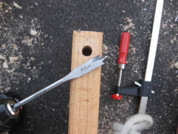 Para la base de la cuna que corte una 2 x 12 a 16".  Cuatro 1/2 orificios a 1" del extremo y 3/4" de la cara 1" profundidad o simplemente taladro hasta llegar al ángulo de una broca de pala.