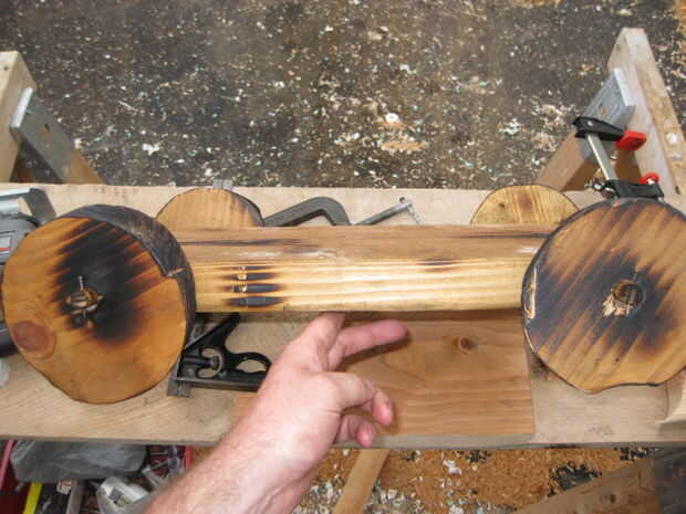 Tomar 3" piezas de 1/2" espigas con clavos 1/4" del extremo e inserte a través del orificio 5/8 ruedas.  Inserte el pasador de la 1/2" con pegamento en el agujero y alrededor del final.  Puede que necesite un persuasivo (martillo en tiendas civilizados).