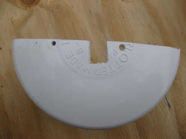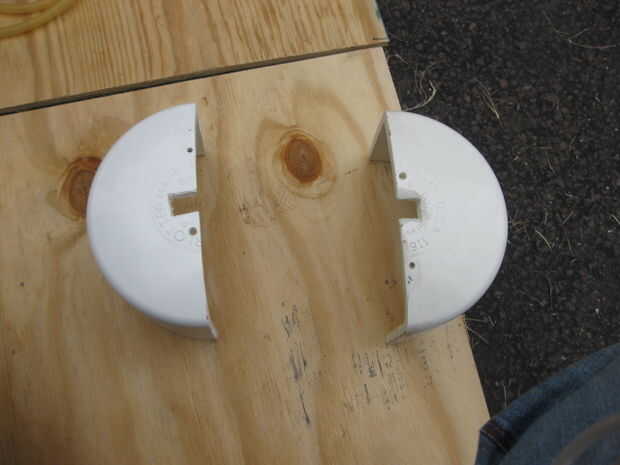 Cortar la tapa de PVC de 6" por la mitad y cortar una muesca en el centro de 5/8" de ancho y 3/4" en la tapa.  Aproximadamente 3/4" del taladro muesca un agujero de 1/4" en el otro lado aproximadamente 1 1/2" de la muesca perfore un orificio de 5/32".