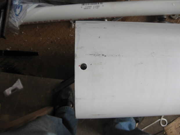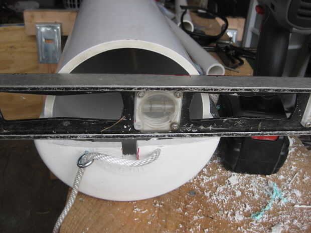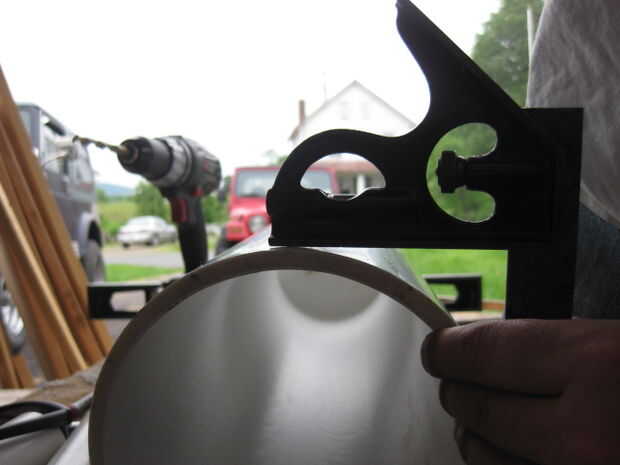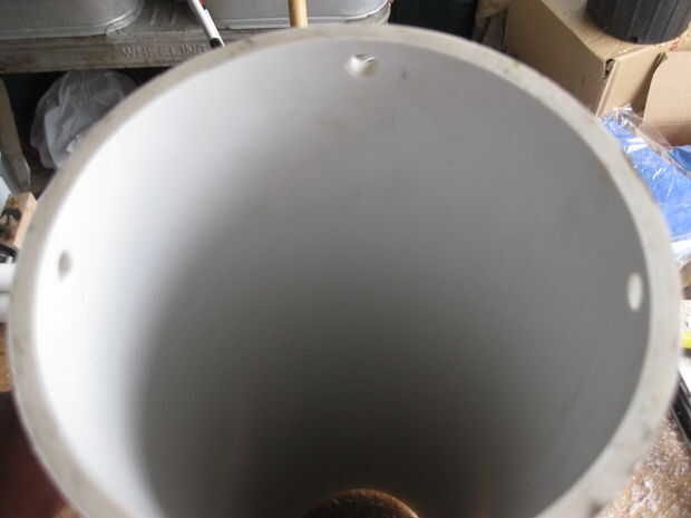 Perfore cuatro agujeros de 3/8" en el extremo sin tapón en él.  Es mejor taladrar a 90 * ángulos de 1/2" de la llanta.  Primer nivel el barril entero con un nivel mayor (puede sólo hacerlo fuera en la primera foto en el medio una tapa).  Utilicé un cuadrado de combo con un nivel en para marcar a los 90 *.  Marque dos puntos que el toque de nivel en una posición entonces moverse alrededor por lo que uno de los puntos es todavía en contacto con la Plaza.  Una vez ellos son perforadas por seguro para suavizar los bordes que cortar a través de la tubería del látex si no redondeado.  Utilicé un papel x-acto cuchillo y arena.