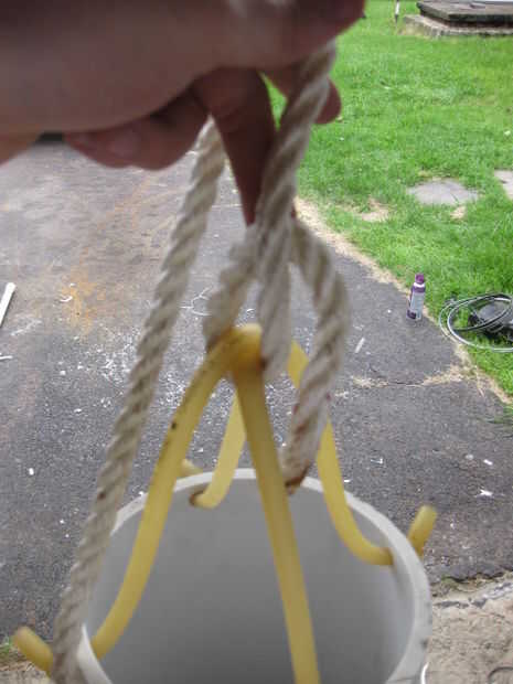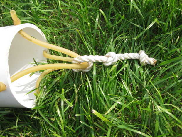 Tomar la 1/2" cuerda y atarla en el tubo de látex.  Uso el epoxi para asegurar el nudo tenga cuidado de no conseguir cualquier epoxi en el látex.  Luego haga dos nudos uno en el centro de la cuerda y al final.