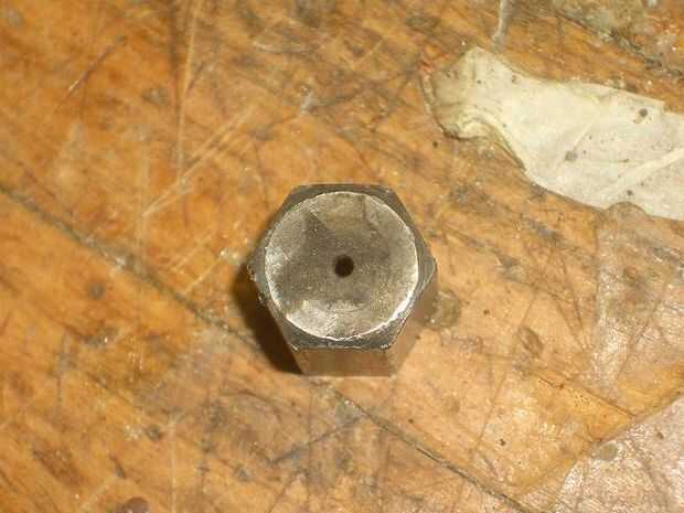 ahora, podemos empezar a taladrar un agujero en la tapa de extremo donde estarán los fusibles. Cuando se selecciona un fusible, no tiene que ser enorme y gruesa. utilizar fusibles de un petardo llamado "little dynamite" y son de color rojos y tienen fusibles; lo hacen muy bien. a continuación, elija una broca pequeña que es el mismo diámetro que el fusible y poner a un lado. Si lo desea, puede tomar un punzón y hacer un pequeño hueco en el centro de la tapa de extremo tan cuando taladra, usted tendrá un agujero centrado. Si realmente no se preocupan; no lo hacen. no efecto de rendimiento. realmente ayuda a tener una prensa del taladro, pero si no, ponga la tapa en la prensa, su poco y tapón de aceite y lejos del taladro.